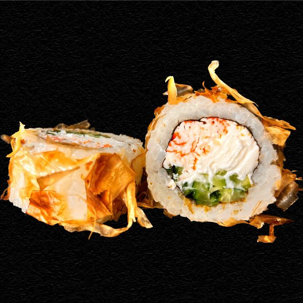 Склад: Рис, Норі, Крем-сир, Огірок, Лосось. У боніто(стружка тунця)